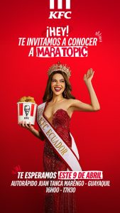 La creadora de contenido y ex Miss Ecuador, Mara Topic, atenderá personalmente a los clientes este jueves 9 de abril, de 16h00 a 17h30, en el Autorápido de KFC ubicado en la Av. Juan Tanca Marengo, en Guayaquil.